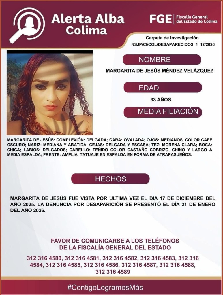 Colima, México, Avanzada (22/01/2026).- La Fiscalía General del Estado activó una Alerta Alba para localizar a Margarita de Jesús Méndez Velázquez, de 33 años de edad, quien se encuentra desaparecida desde el pasado 17 de diciembre de 2025.