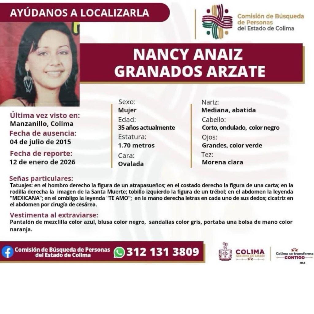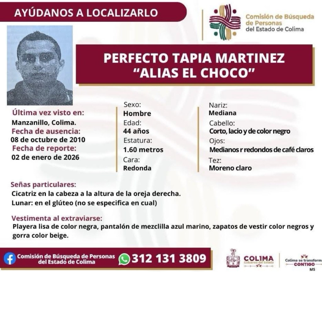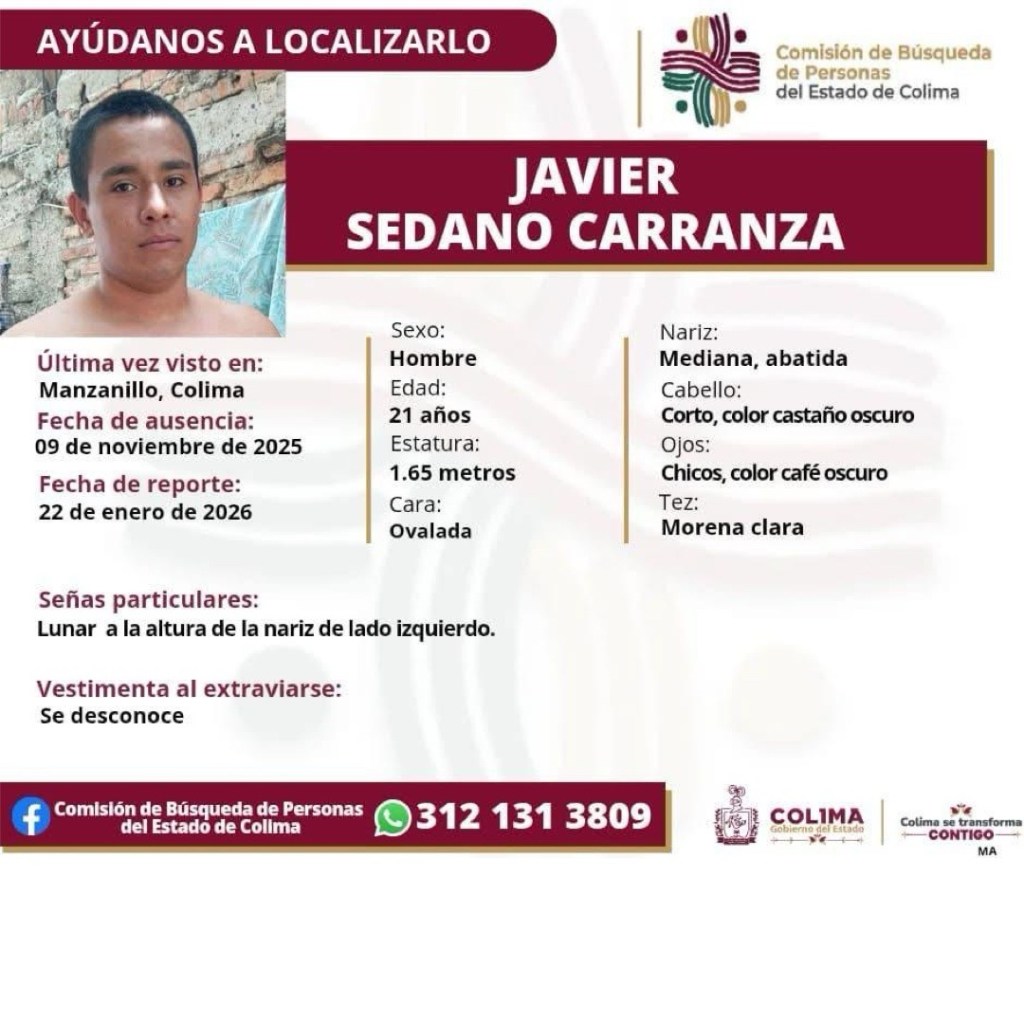 Colima, México, Avanzada (25/01/2026).- La Comisión de Búsqueda de Personas del Estado de Colima reportó la desaparición de siete personas en el municipio de Manzanillo durante los primeros 23 días del año, de acuerdo con las fichas oficiales difundidas a través de sus redes sociales.