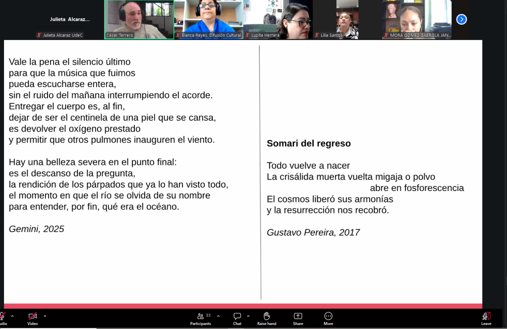 César Augusto, profesor de la Facultad de Ciencias de la UdeC, impartió la charla virtual “Poesía; reducto de la inteligencia humana”, hace unos días, como parte de las Jornadas Académicas 2026 que organiza la Universidad de Colima.