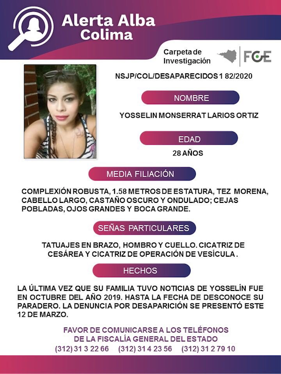 Yosselin Monserrat Larios Ortiz tiene 28 años de edad, complexión robusta, 1.58 metros de estatura, tez morena, cabello largo, castaño oscuro y ondulado; cejas pobladas, ojos grandes y boca grande. La última vez que su familia tuvo noticias de ella fue en octubre del año 2019.
