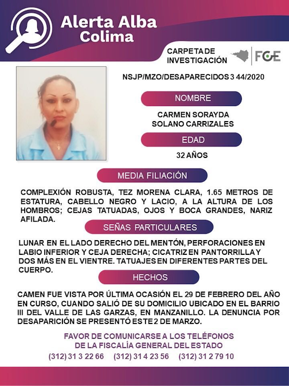 Carmen Sorayda Solano Carrizales tiene 32 años de edad, complexión robusta, tez morena clara, 1.65 metros de estatura, cabello negro y lacio, a la altura de los hombros; cejas tatuadas, ojos y boca grandes, nariz afilada. Fue vista por última vez el 29 de febrero del año en curso, cuando salió de su domicilio ubicado en el Barrio III del Valle de las Garzas, en Manznanillo.