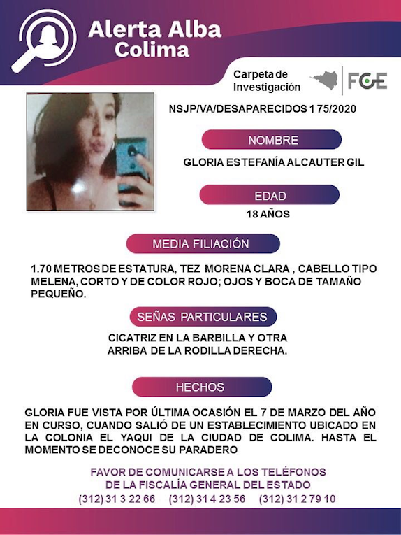 Gloria Estefanía Alcauter Gil tiene 18 años de edad, mide 1.70 metros de estatura, tez morena clara, cabello tipo melena, corto y de color rojo; ojos y boca de tamaño pequeño. Fue vista por última ocasión el 7 de marzo del año en curso, cuando salió de un establecimiento ubicado en la colonia El Yaqui de la ciudad de Colima.