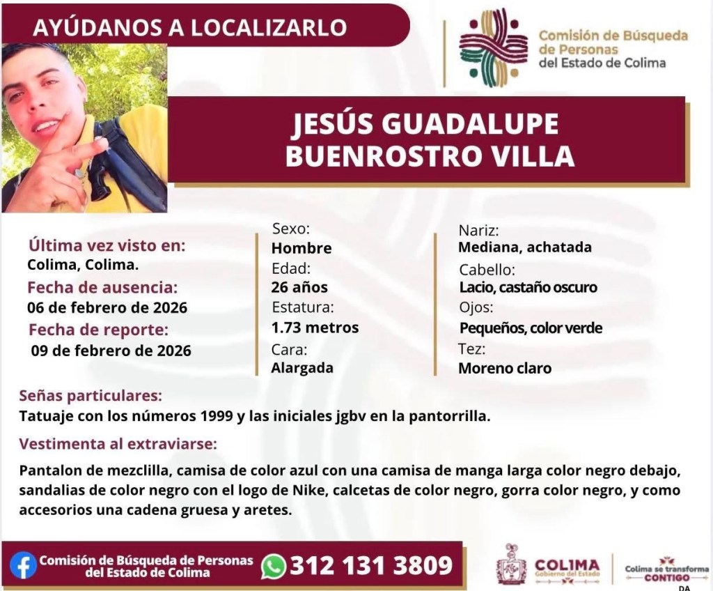 Colima, México, Avanzada (09/02/2026).- La Comisión de Búsqueda de Personas del Estado de Colima emitió una ficha para localizar a Jesús Guadalupe Buenrostro Villa, de 26 años de edad, quien fue visto por última vez en el municipio de Colima.