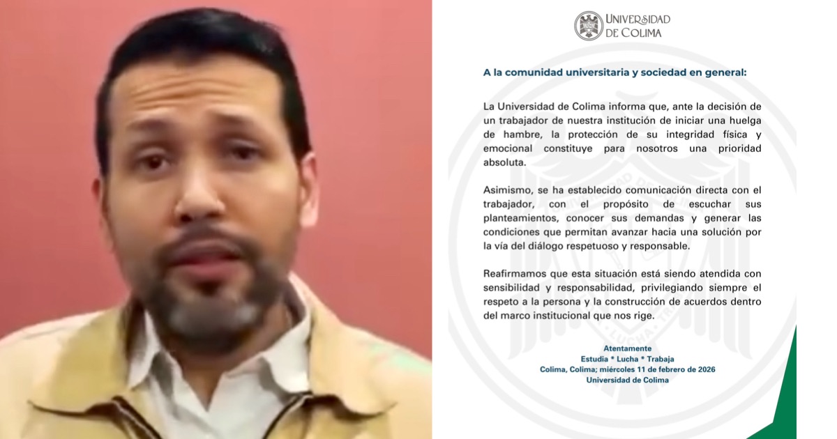 Por su parte, la Universidad de Colima informó, mediante un comunicado dirigido a la comunidad universitaria y a la sociedad en general, que ante la decisión del trabajador de iniciar una huelga de hambre, la protección de su integridad física y emocional constituye una prioridad absoluta para la institución.