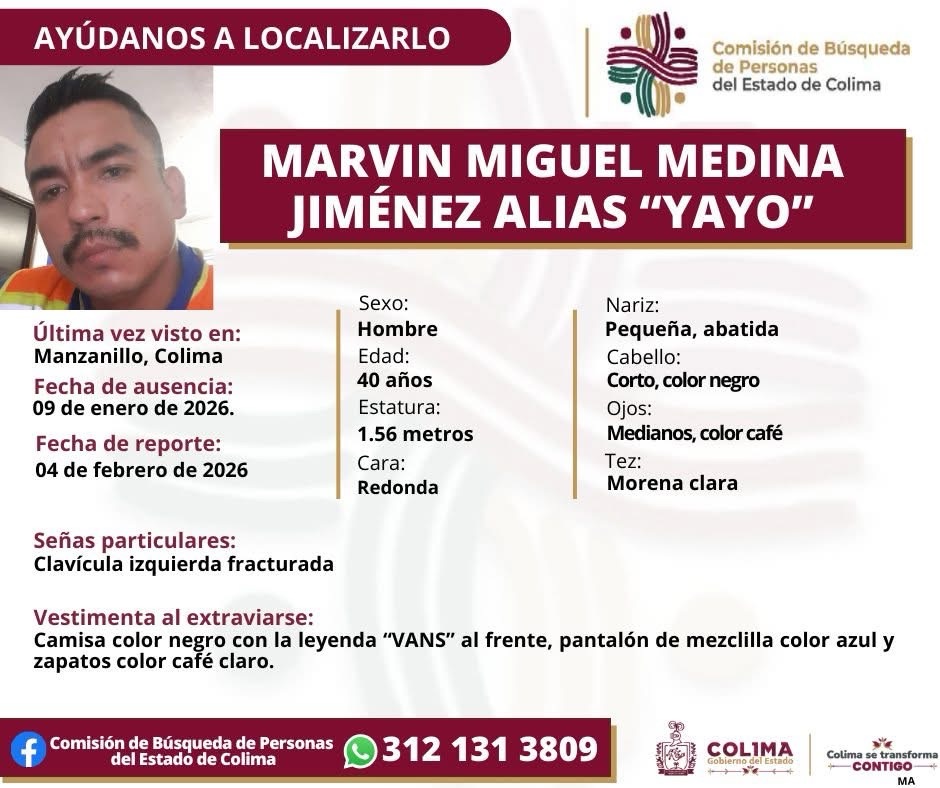 Colima, México, Avanzada (11/02/2026).- La Comisión de Búsqueda de Personas del Estado de Colima emitió una ficha para localizar a Marvin Miguel Medina Jiménez, alias “Yayo”, de 40 años de edad, quien fue visto por última vez en el municipio de Manzanillo.