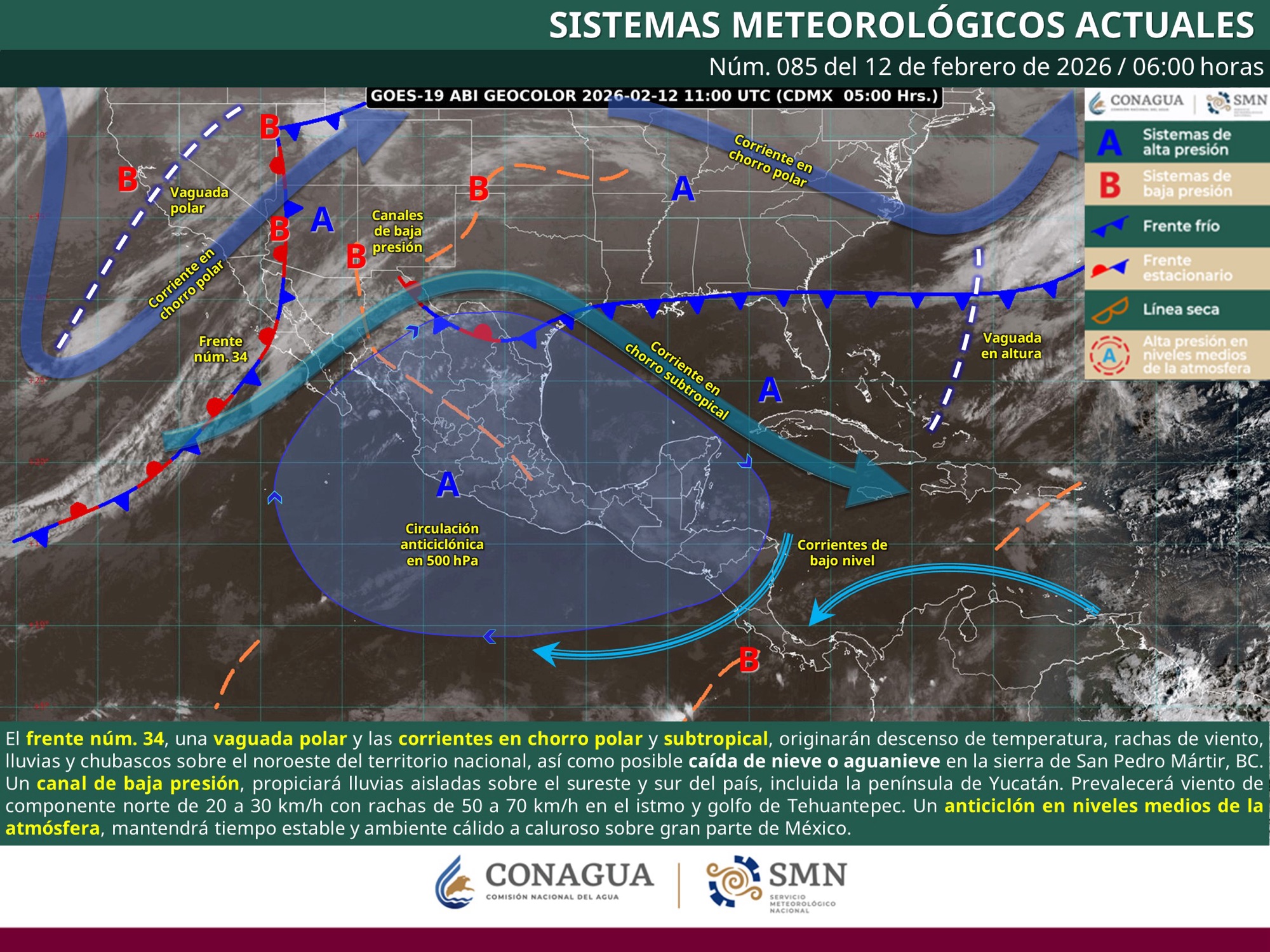 En el contexto nacional, el frente frío número 34 y una vaguada polar provocarán descenso de temperatura, lluvias y posible caída de nieve o aguanieve en la sierra de San Pedro Mártir, en Baja California. Asimismo, se esperan chubascos en Baja California y lluvias aisladas en estados del sureste.