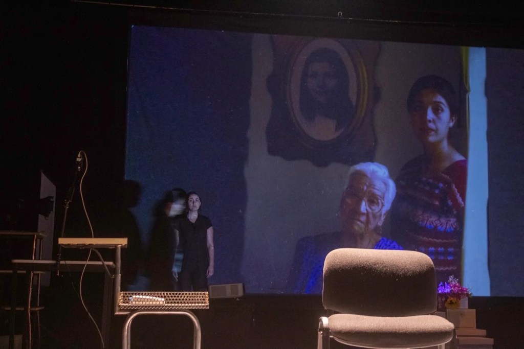 En la imagen, a la derecha, las tres Alicias en la pantalla del teatro: abuela, madre, hija. (Luna Rondón)