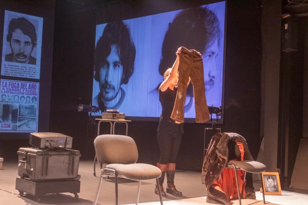 En escena, Alicia cuenta también la historia de Enrique Pérez Mora, el Tenebras, su papá, mientras Shantal muestra una camisa a cuadros, un pantalón de pana y un suéter rojo. “Mi mamá vio en el periódico el cuerpo de mi papá con la ropa que ella le había ayudado a escoger”, recuerda. La pareja se conoció durante la fuga de Oblatos; en mayo, Alicia de los Ríos estaba embarazada, y un mes después Enrique murió en un enfrentamiento con agentes de seguridad.