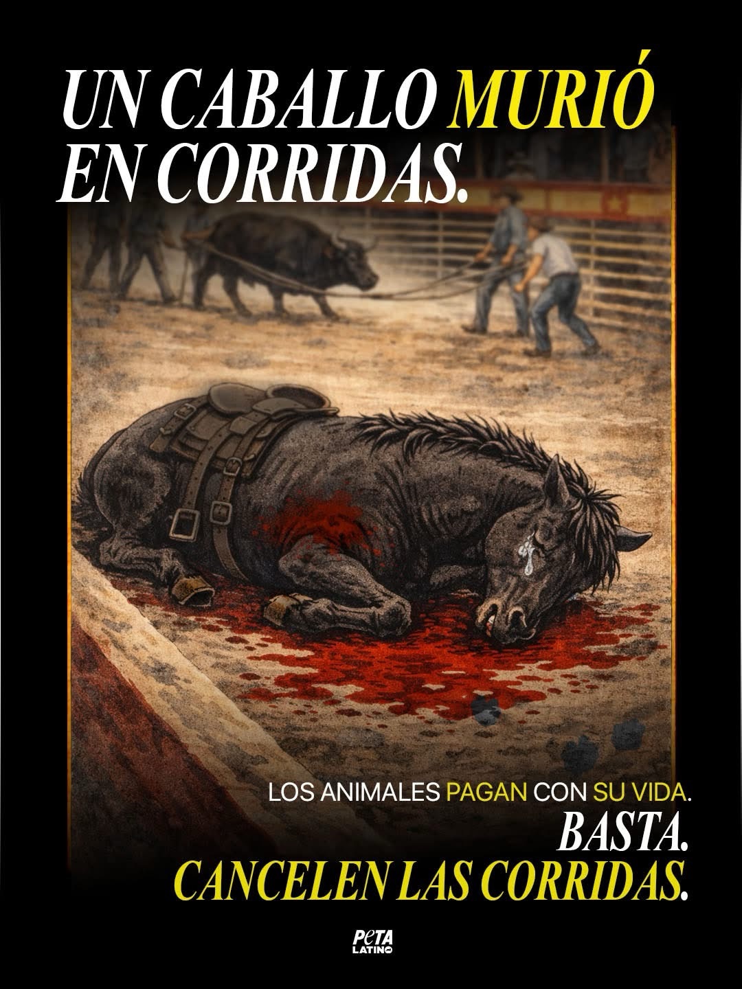 Villa de Álvarez, Colima, México (15/02/2026).— La organización internacional PETA Latino exigió la cancelación inmediata de las corridas de toros en las Fiestas Charrotaurinas de Villa de Álvarez, luego de que un caballo muriera tras ser corneado durante uno de los festejos.