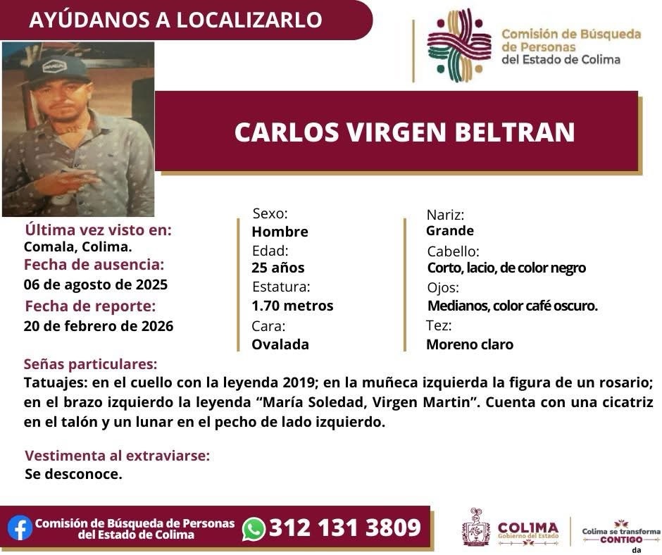 Colima, México, Avanzada (20/02/2026).- La Comisión de Búsqueda de Personas del Estado de Colima emitió una ficha para localizar a Carlos Virgen Beltrán, un joven de 25 años de edad reportado como desaparecido en el municipio de Comala.