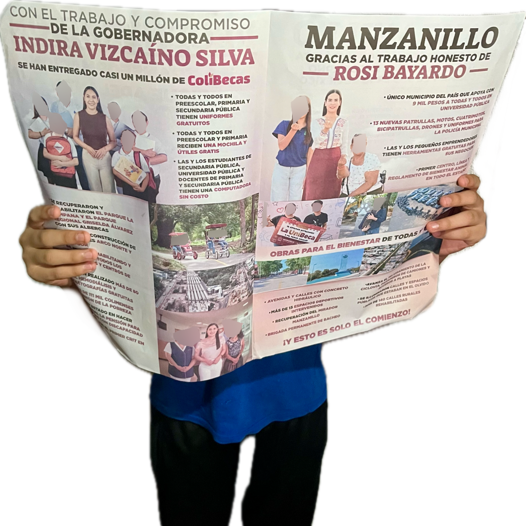 Colima, México, Avanzada (21/02/2026).- Un pliego impreso de 43 por 56 centímetros, doblado a la mitad y distribuido en diversos municipios de Colima, ha generado polémica luego de que la exalcaldesa de Manzanillo, Griselda Martínez Martínez, lo señalara como propaganda anticipada con miras al proceso electoral de 2027.