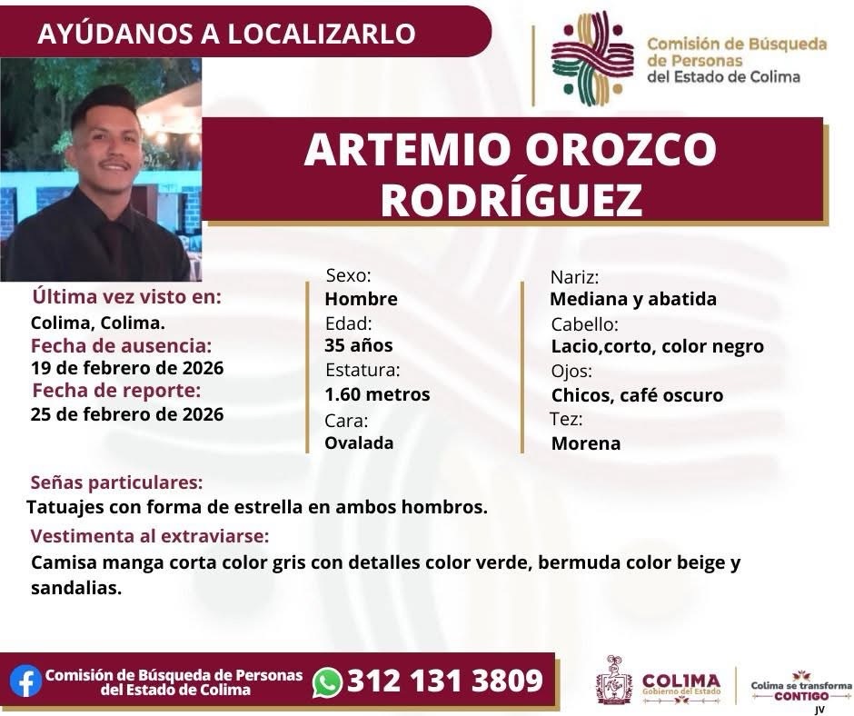 Colima, México, Avanzada (25/02/2026).- La Comisión de Búsqueda de Personas del Estado de Colima activó una ficha para localizar a Artemio Orozco Rodríguez, de 35 años de edad, quien fue reportado como desaparecido en el municipio de Colima.