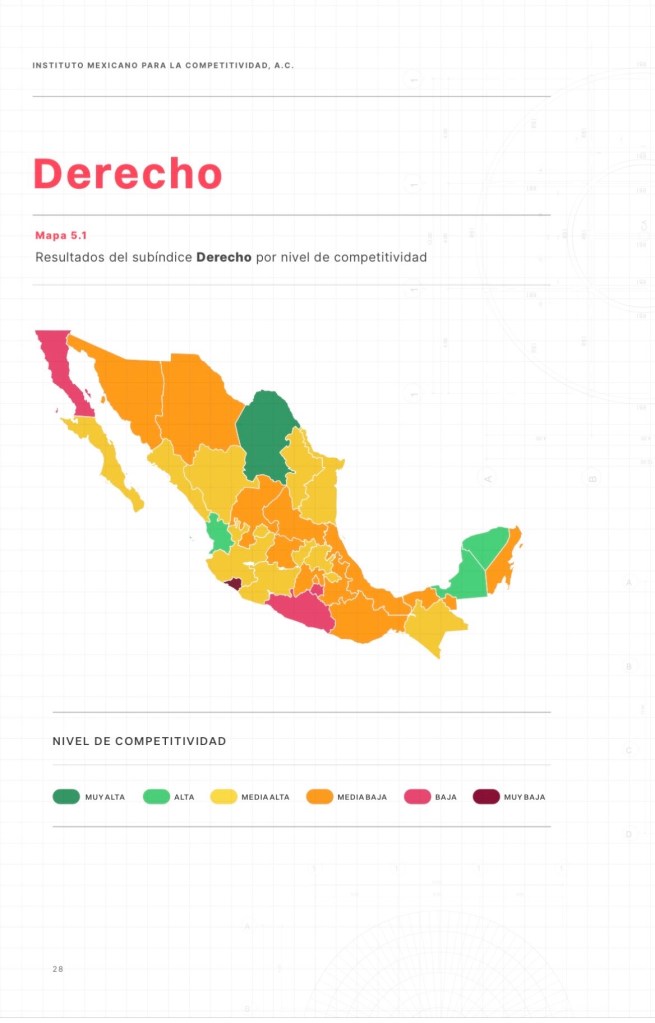 De acuerdo con el reporte, el subíndice de Derecho evalúa variables relacionadas con seguridad pública, incidencia delictiva, percepción de seguridad, delitos no denunciados, servicios notariales y agresiones a periodistas, factores que influyen directamente en la calidad de vida de la población y en la confianza para invertir.