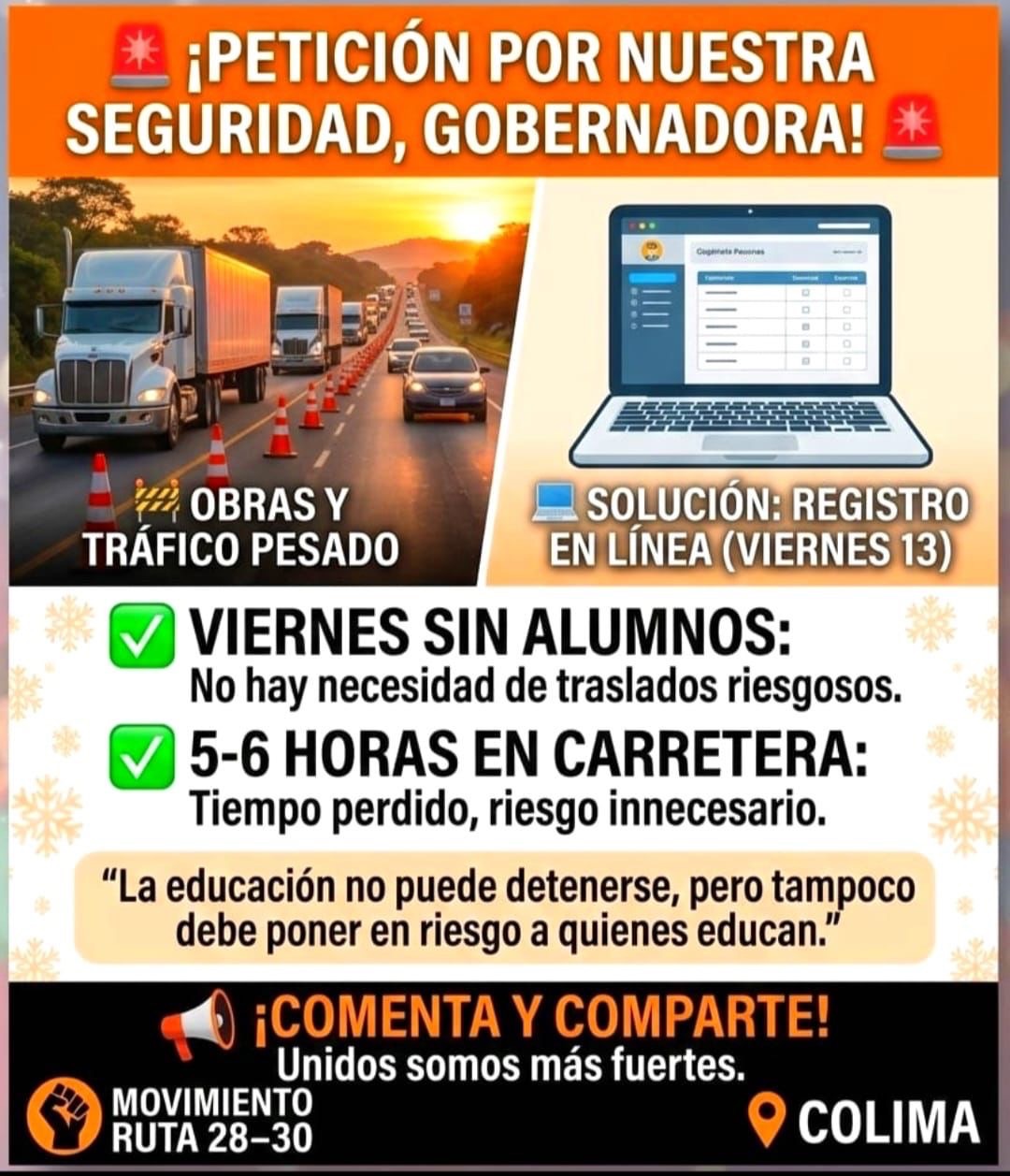 Colima, México, Avanzada (10/03/2026).- Integrantes del Movimiento Ruta 28-30 solicitaron a la gobernadora de Colima, Indira Vizcaíno Silva, que autorice que el registro de calificaciones del próximo viernes 13 se realice de manera virtual para docentes que laboran en municipios costeros e Ixtlahuacán, con el fin de evitar traslados prolongados por carreteras en obra y con tráfico pesado.