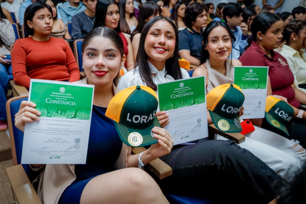 Colima, México, Comunicado (11/03/2026).- Este miércoles 11 de marzo, en el auditorio de la Federación de Estudiantes Colimenses, Christian Jorge Torres Ortiz Zermeño, rector de la Universidad de Colima, entregó las constancias que acreditan a las 40 mujeres estudiantes por su participación en la Escuela de Formación Política para Mujeres Estudiantes. Esta escuela tiene como objetivo fortalecer el liderazgo, la participación y formación política de estudiantes de nivel medio superior y superior de la Universidad de Colima.