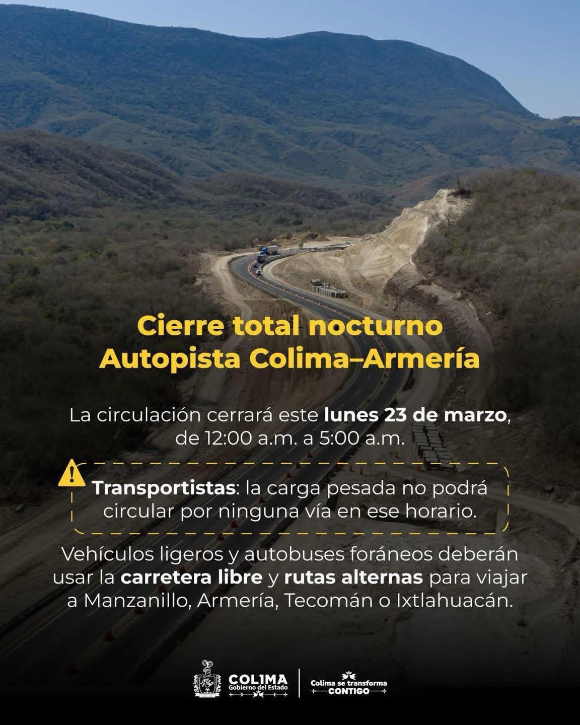 Colima, México, Avanzada (22/03/2026).- La Secretaría de Infraestructura, Desarrollo Urbano y Movilidad informó que la autopista Colima–Manzanillo será cerrada totalmente durante la madrugada del próximo lunes 23 de marzo, debido a la realización de trabajos nocturnos.