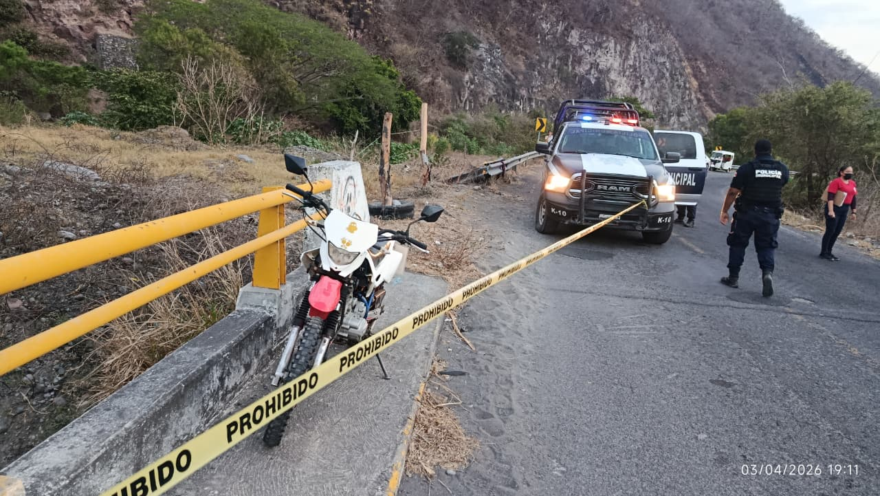 Colima, México, Avanzada (04/04/2026).- Un motociclista perdió la vida la tarde-noche de este 3 de abril tras sufrir un accidente sobre la carretera a la comunidad de Jala, antes de llegar al balneario Los Amiales.