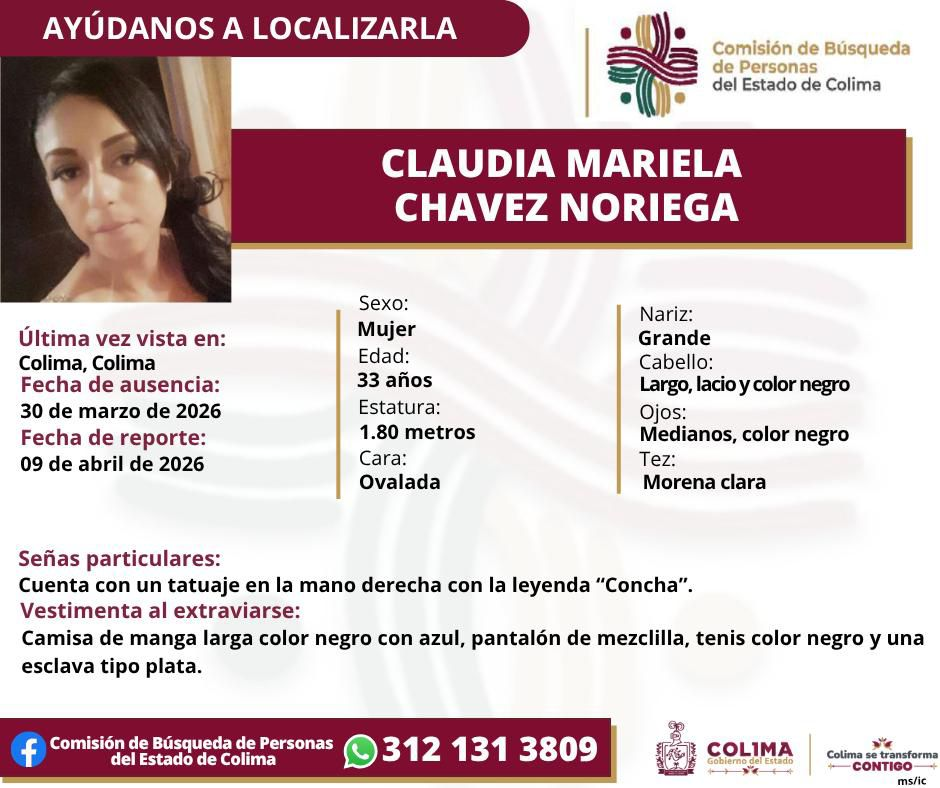 Colima, México, Avanzada (10/04/2026).- La Comisión de Búsqueda de Personas del Estado de Colima emitió una ficha para localizar a Claudia Mariela Chávez Noriega, de 33 años de edad, quien fue reportada como desaparecida en el municipio de Colima.