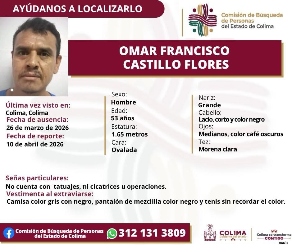 COLIMA2 días agoActivan ficha de búsqueda por desaparición de José Luis Toscano Ramírez en Colima