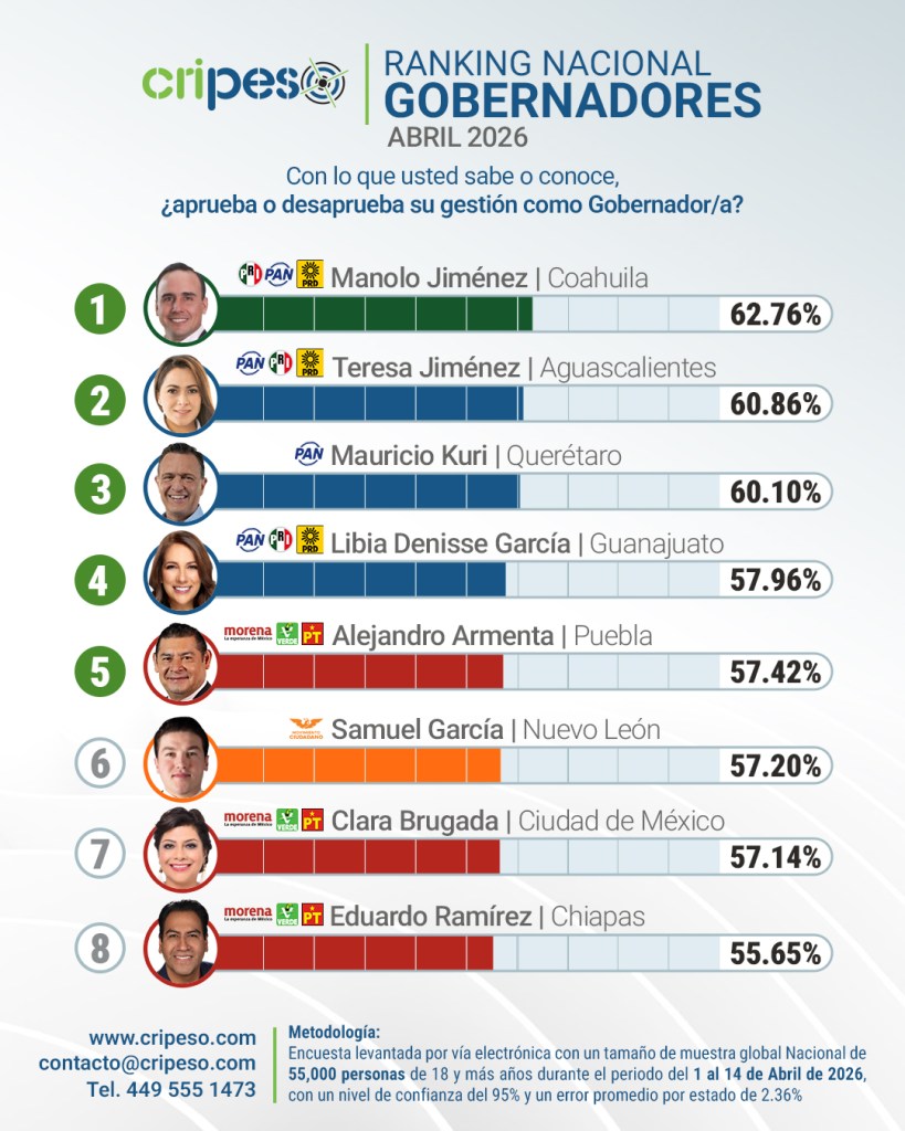 En contraste, el estudio —basado en una muestra de 55 mil ciudadanos— posiciona en el primer lugar al gobernador de Coahuila, Manolo Jiménez Salinas, con 62.76% de aprobación, seguido por Teresa Jiménez Esquivel, de Aguascalientes, con 60.86%, y Mauricio Kuri González, de Querétaro, con 60.10%, todos pertenecientes a coaliciones opositoras.