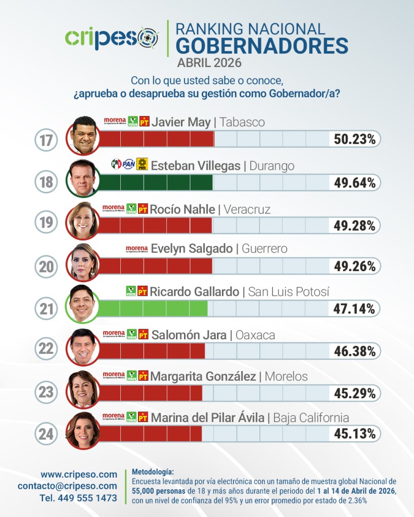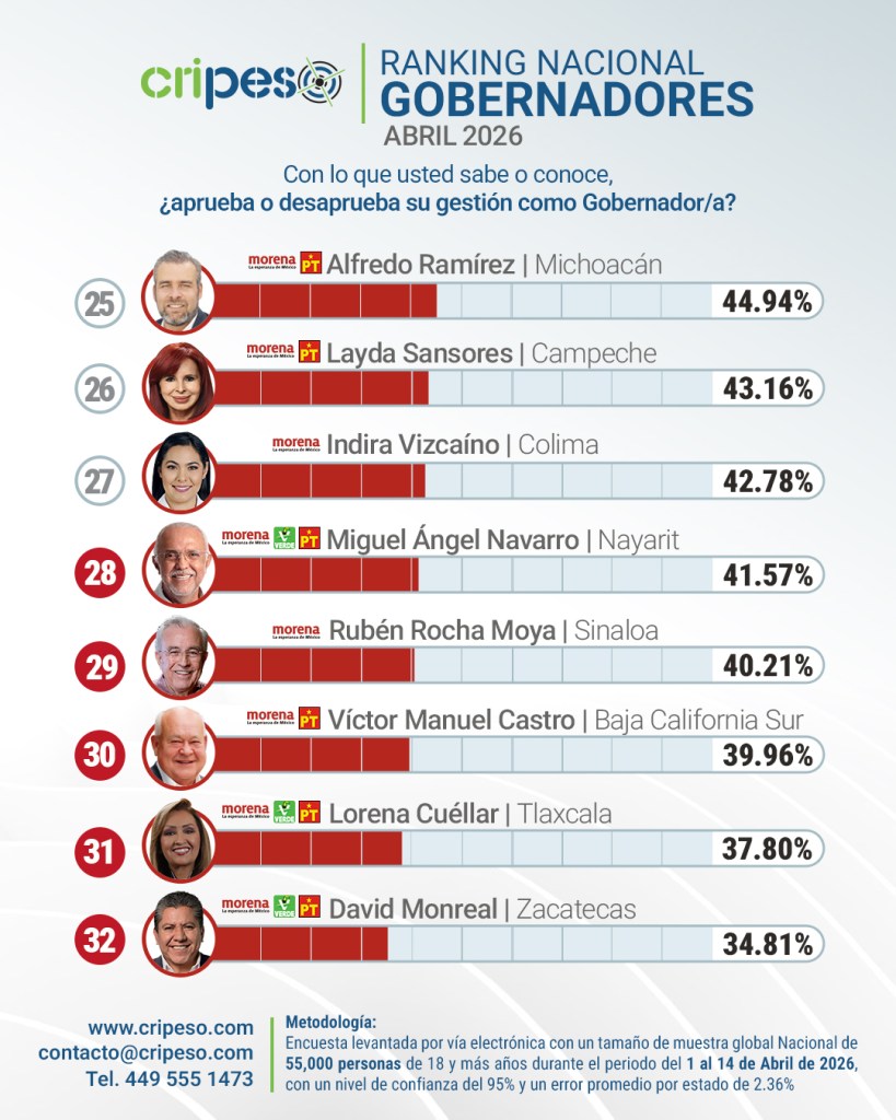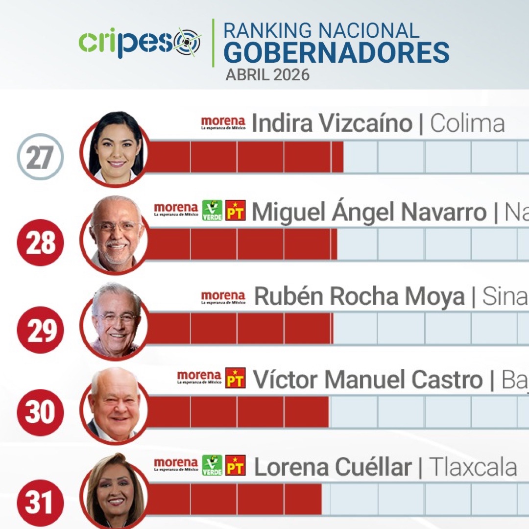 Los datos confirman que, a nivel nacional, la aprobación ciudadana tiende a concentrarse en gobiernos de oposición, mientras que varias administraciones afines a Morena enfrentan un desgaste en la percepción pública, particularmente en entidades con mayores desafíos en materia de seguridad y desarrollo económico.
