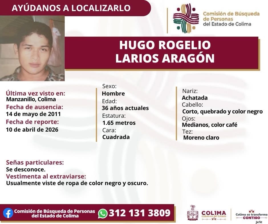 Colima, México, Avanzada (21/04/2026).- La Comisión de Búsqueda de Personas del Estado de Colima difundió una ficha para localizar a Hugo Rogelio Larios Aragón, quien fue reportado como desaparecido en el municipio de Manzanillo desde hace más de una década.