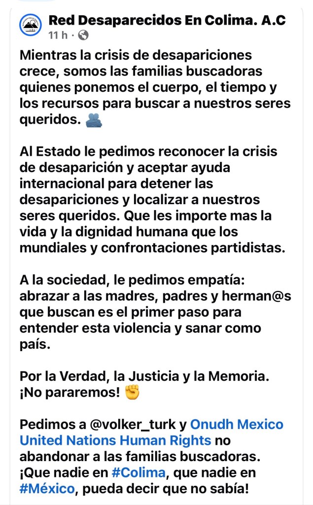 Colima, México, Avanzada (23/04/2026).- La Red de Desaparecidos en Colima difundió un video y un mensaje en redes sociales en el que hizo un llamado urgente a la comunidad internacional, particularmente al Alto Comisionado de las Naciones Unidas para los Derechos Humanos, Volker Türk, para visibilizar y atender la crisis de desapariciones en México.
