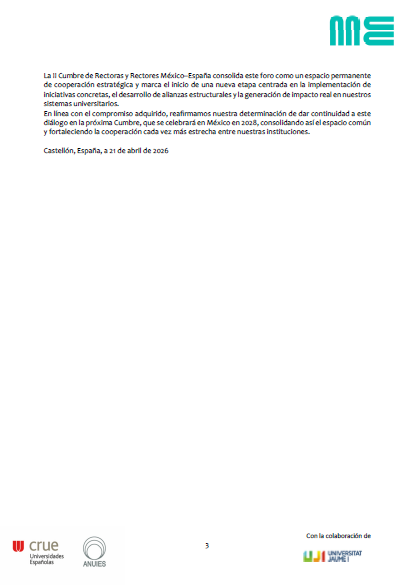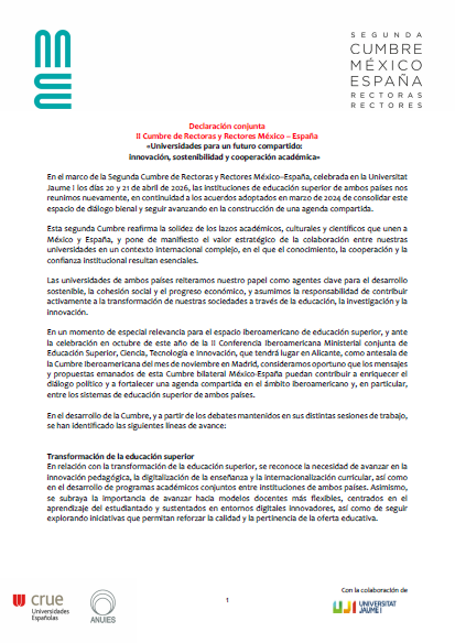 Colima, México, Avanzada (23/04/2026).- En el marco de la II Cumbre de Rectoras y Rectores México – España, realizada el 20 y 21 de abril de 2026 en la Universitat Jaume I, en Castellón, España, 24 universidades españolas y 32 universidades mexicanas suscribieron una declaración conjunta que reafirma su compromiso con la innovación, la sostenibilidad y la cooperación académica como ejes para enfrentar los desafíos globales.