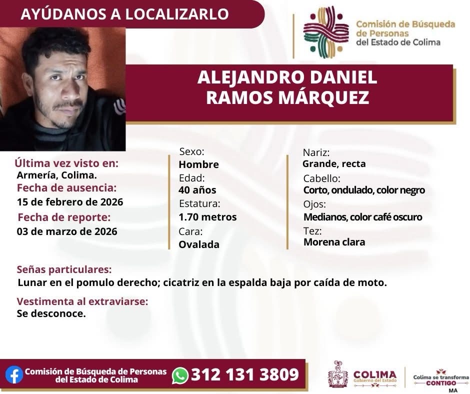 Colima, México, Avanzada (24/04/2026).- La Comisión de Búsqueda de Personas del Estado de Colima activó una ficha para localizar a Alejandro Daniel Ramos Márquez, de 40 años de edad, quien fue reportado como desaparecido en el municipio de Armería.