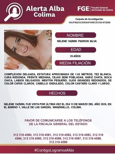 Colima, México, Avanzada (25/04/2026).– La Fiscalía General del Estado de Colima activó una Alerta Alba para la localización de Selene Yazmín Padrón Silva, de 29 años de edad, quien fue reportada como desaparecida tras ser vista por última vez el pasado 13 de marzo de 2026 en el barrio 1 del Valle de las Garzas, en el municipio de Manzanillo.