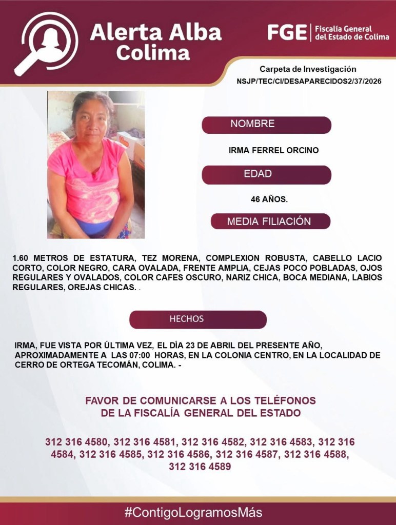 Colima, México, Avanzada (25/04/2026).- La Fiscalía General del Estado de Colima activó una Alerta Alba para la búsqueda y localización de Irma Ferrel Orcino, de 46 años de edad, quien fue reportada como desaparecida en el municipio de Tecomán.