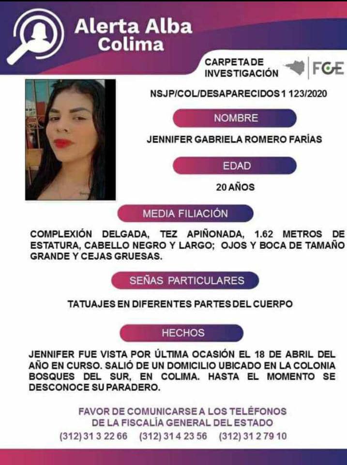 Colima, México, Avanzada (26/04/2020).- Jennifer Gabriela Romero Farías tiene 20 años de edad, subió a un taxi en Colima y desde entonces se desconoce su paradero.