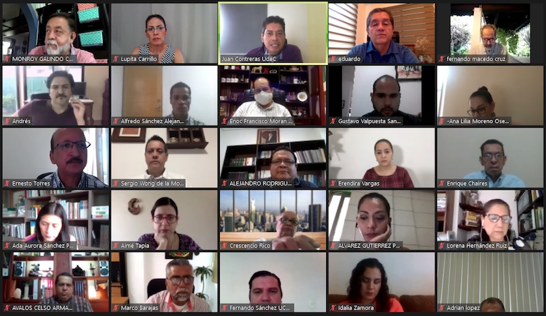 Colima, México, Comunicado (24/08/2020).- Este viernes el rector de la Universidad de Colima, José Eduardo Hernández Nava, presidió dos reuniones de trabajo a distancia con directoras y directores de bachillerato y licenciatura, en las que se detallaron las medidas de seguridad sanitaria y la logística a seguir durante el proceso de admisión 2020, especialmente en la aplicación del examen del CENEVAL, que será presencial para ambos niveles educativos.