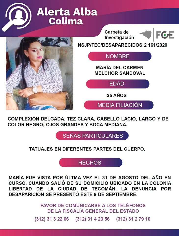 María del Carmen Melchor Sandoval tiene 25 años de edad, es de complexión delgada, piel clara, cabello lacio largo y de color negro, tiene los ojos grandes y la boca mediana. Tiene tatuajes en diferentes partes del cuerpo y fue vista por última vez el 31 de agosto del año en curso, cuando salió de su domicilio ubicado en la colonia Libertad de la ciudad de Tecomán.