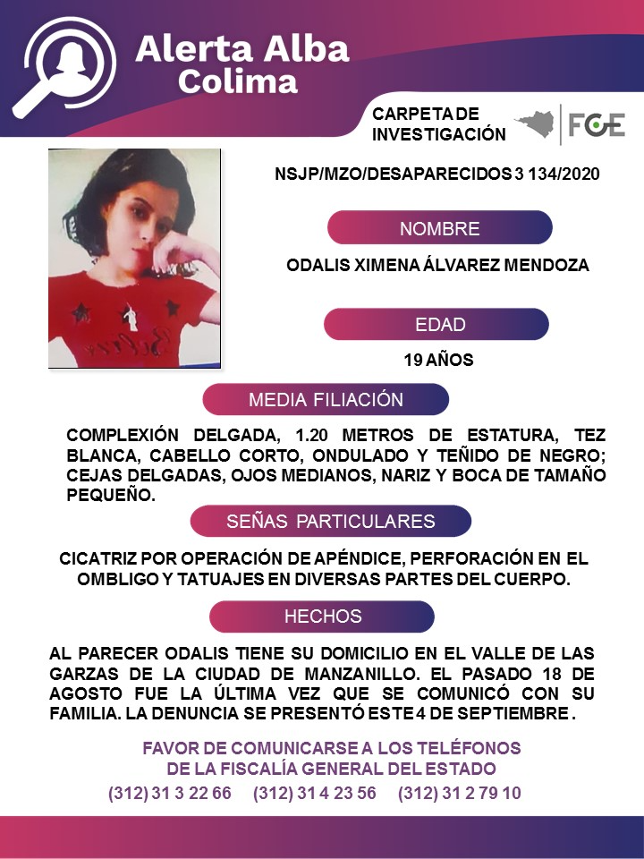 Odalis Ximena Álvarez Mendoza tiene 19 años de edad, es de complexión delgada, mide 1.20 m de estatura, es de piel blanca, cabello corto ondulado y teñido de negro, tiene las cejas delgadas, ojos medianos, nariz y boca de tamaño pequeño, presenta una cicatriz por operación de apendicitis, perforación en el ombligo y tatuajes en diversas partes del cuerpo. Al parecer Odalis tiene su domicilio en el Valle de las Garzas de la ciudad de Manzanillo, el pasado 18 de agosto fue la última vez que se comunicó con su familia. La denuncia se presentó este 4 de septiembre