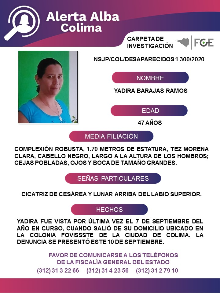 Yadira Barajas Ramos tiene 47 años de edad, es de complexión robusta, mide 1.70 m de estatura, tiene la piel morena clara, cabello negro largo a la altura de los hombros, cejas pobladas, ojos y boca de tamaño grandes, presenta una cicatriz por cesárea y lunar arriba del labio superior. Yadira fue vista por última vez el 7 de septiembre del año en curso cuando salió de su domicilio ubicado en la colonia FOVISSSTE de la ciudad de Colima, la denuncia se presentó este 10 de septiembre