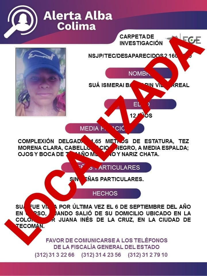 Colima, México, Avanzada (13/09/2020).- La Fiscalía General del Estado de Colima activó tres Alertas Alba, por mujeres que “desaparecieron” al salir de su domicilio. La Fiscalía solicita la colaboración de la ciudadanía con la finalidad de que compartan la información y poder localizarlas.