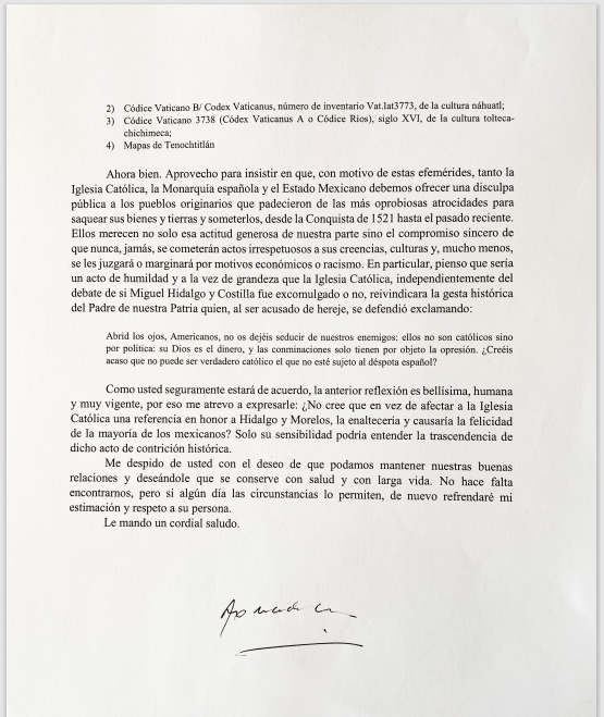 En la misiva, el presidente reiteró su petición al papa Francisco, para que en el marco de la celebración de los 700 años de la fundación de México-Tenochtitlán, la iglesia Católica se disculpe con los pueblos originarios por las atrocidades perpetradas con la finalidad de saquear “sus bienes y tierras y someterlos, desde la Conquista de 1521 hasta el pasado reciente”.