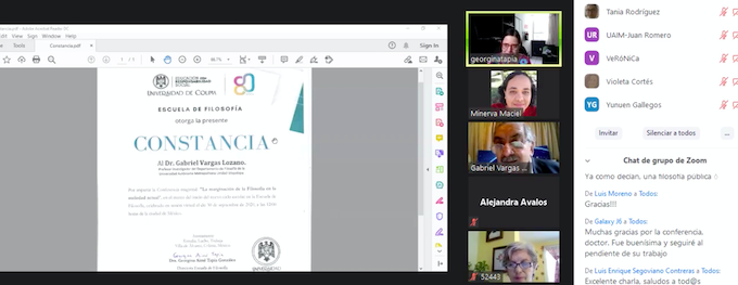 Manzanillo, México, Comunicado (18/10/2020).- El filósofo, académico e intelectual mexicano, Gabriel Vargas Lozano, impartió la conferencia virtual “La marginación de la Filosofía en la sociedad actual”, a estudiantes y profesores de la Escuela de Filosofía de la Universidad de Colima, en días pasados.