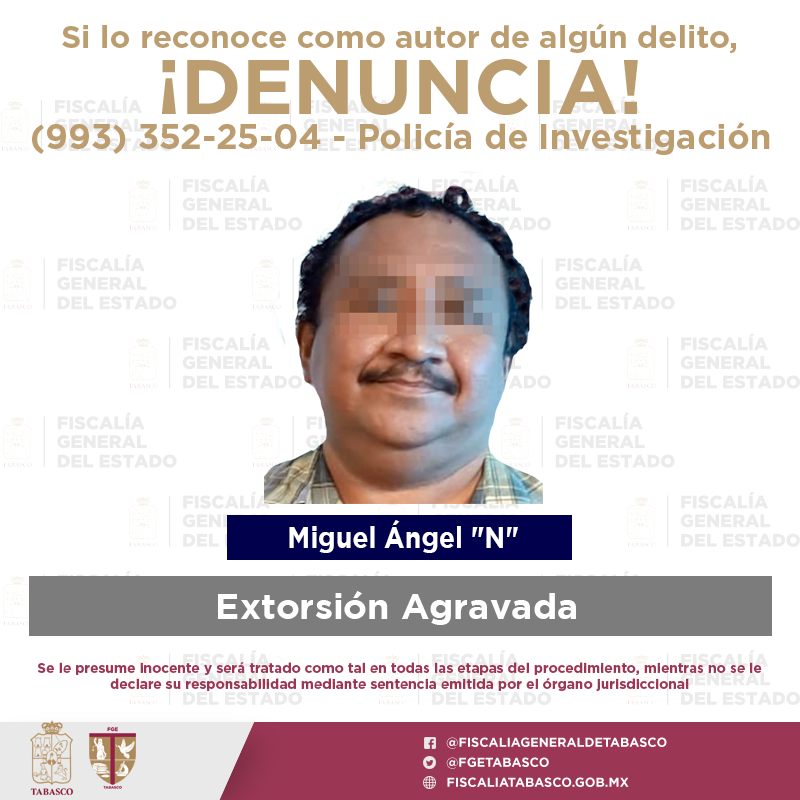Miguel Ángel “N” fue denunciado por un ciudadano, respecto a que, en su calidad de Fiscal del Ministerio Público del Sistema Tradicional de Frontera, Centla habría participado en la comisión del delito de extorsión agravada. Al cabo de las indagatorias se procedió a ejecutar la orden de aprehensión en su contra para su posterior traslado al Centro de Reinserción Social del Estado de Tabasco, en tanto, continúa el proceso penal.
