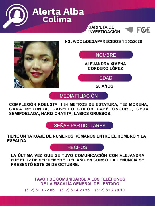 Alejandra Ximena Cordero López tiene 20 años de edad, es de complexión robusta, mide 1metro con 84 centímetros de estatura, tiene piel morena, cara redonda, cabello color café oscuro, cejas semipobladas, nariz chatita y labios gruesos. Como señas particulares tiene un tatuaje de números romanos entre el hombro y la espalda. La última vez que se tuvo comunicación con Alejandra por el 12 de septiembre del año en curso. La denuncia se presentó este 26 de octubre.
