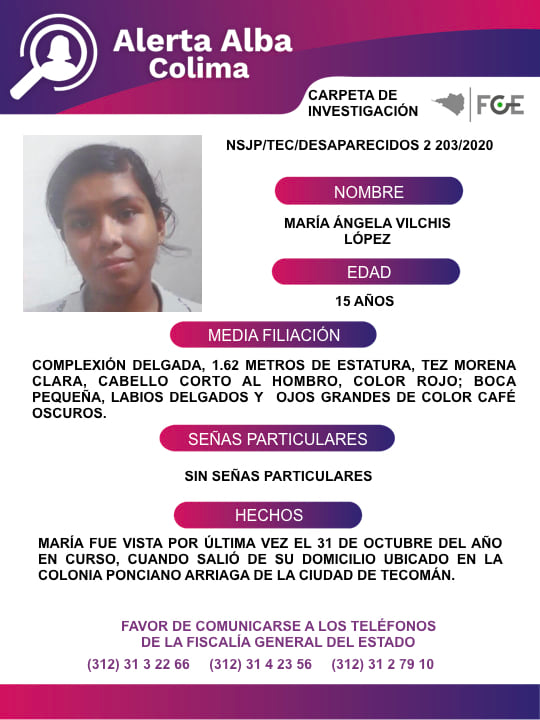 María Angela Vilchis López tiene 15 años de edad, es de complexión delgada, mide 1.62 metros de estatura, tiene piel morena clara, cabello corto al hombro, color rojo; boca pequeña, labios delgados y ojos grandes de color café oscuros. María fue vista por última vez el 31 de octubre del año en curso, cuando salió de su domicilio ubicado en la colonia Ponciano Arriaga de la ciudad de Tecomán.