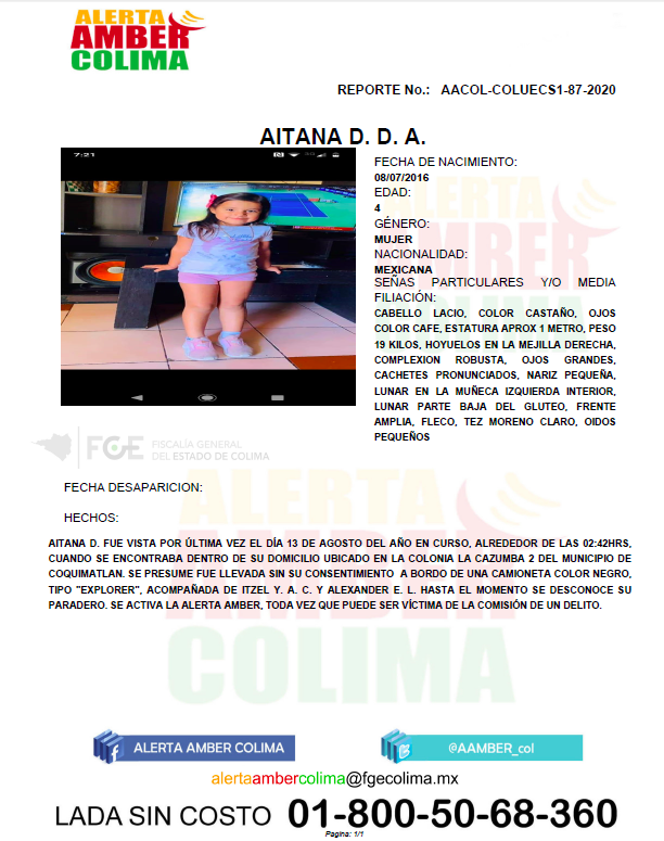 La ficha de Alerta Amber expone: “se presume fue llevada sin su consentimiento a bordo de una camioneta color negro tipo Explorer, acompañada de Itzel Y. A.C. y Alexander E.L, hasta el momento se desconoce su paradero. Se activa la Alerta Amber, toda vez que puede ser víctima de la comisión de un delito”, concluye la ficha emitida por la FGE.