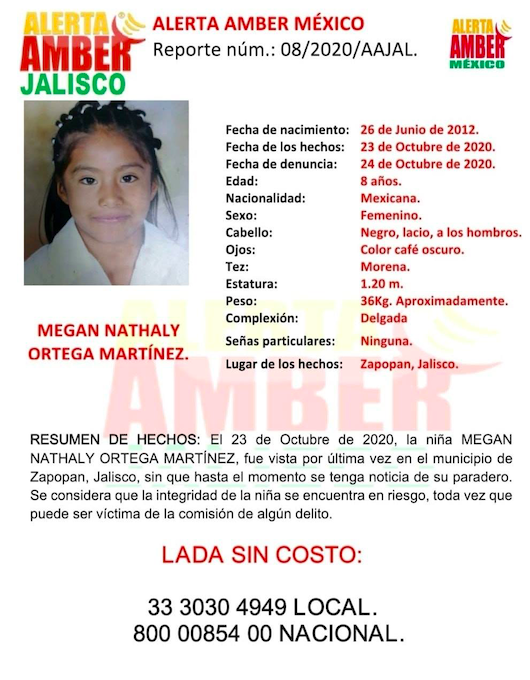 Megan Nathaly Ortega Martínez tiene ocho años de edad, el cabello negro, lacio, a los hombros. Tiene ojos cafés oscuros, piel morena, mide 1.20 metros de estatura. El 23 de octubre de 2020, la niña Megan fue vista por última vez en el municipio de Zapopan, Jalisco, sin que hasta el momento se tenga noticias de su paradero. Se considera que la integridad de la niña se encuentra en riesgo, toda vez que puede ser víctima de la comisión del delito.