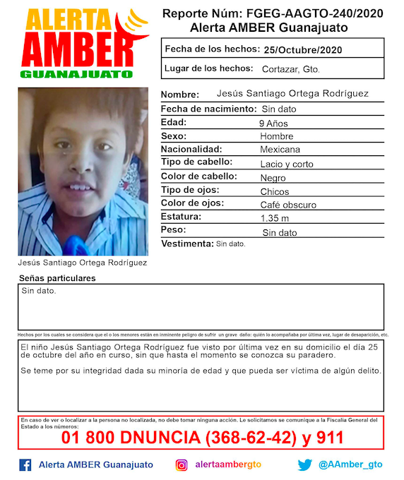 Jesús Santiago Ortega Rodríguez tiene nueve años de edad tiene el cabello lacio y corto color negro ojos chicos color café oscuro mide 1.35 m de estatura. El niño Jesús Santiago fue visto por última vez en su domicilio el día 25 de octubre del año en curso sin que hasta el momento se conozca su paradero. Se teme por su integridad dada su minoría de edad y que pueda ser víctima de algún delito.