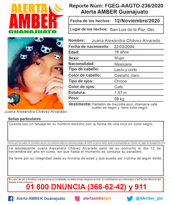 Juana Alexandra Chávez Alvarado tiene 16 años de edad, tiene el cabello lacio y corto, castaño claro, tiene los ojos chicos color café y mide 1.57 metros de estatura. Como señas particulares cuenta con un tatuaje en su hombro derecho con la forma de una cruz en color negro. Juana salió de su domicilio el día 12 de noviembre del año en curso, sin que hasta el momento se conozca su paradero. Se teme por su integridad dada su minoría de edad y que pueda ser víctima de algún delito.