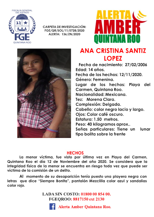 Ana Cristina Santis López López tiene 14 años de edad, es de piel morena clara, tiene el cabello color negro lacio y largo. Los ojos color café oscuros. Mide 1.50 metros de estatura y como señas particulares tiene un lunar tipo bolita sobre la frente. La menor víctima, fue vista por última vez en Playa del Carmen, Quintana Roo el día 12 de noviembre del año en curso. Se considera que la integridad física de la menor se encuentra en riesgo toda vez que puede ser víctima de la comisión de un delito. Al momento de su desaparición tenía puesta una playera negra con letras que dice “Siempre bonita”, pantalón de mezclilla color azul y sandalias color rojo.