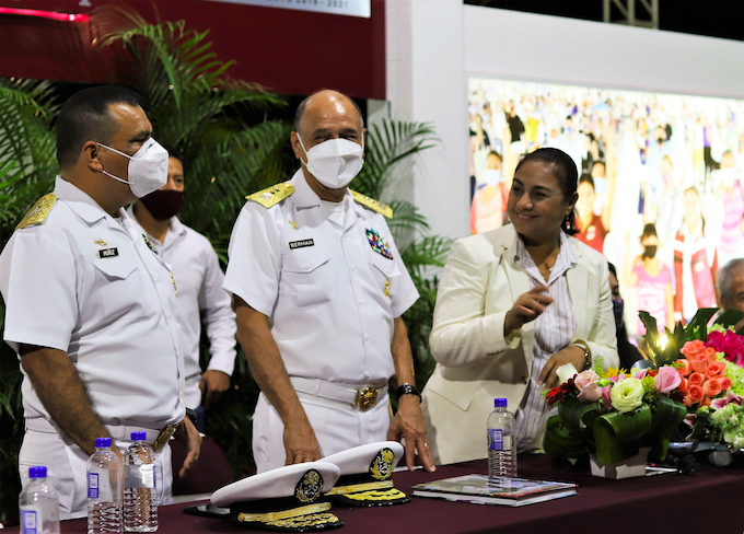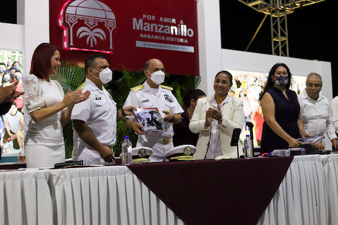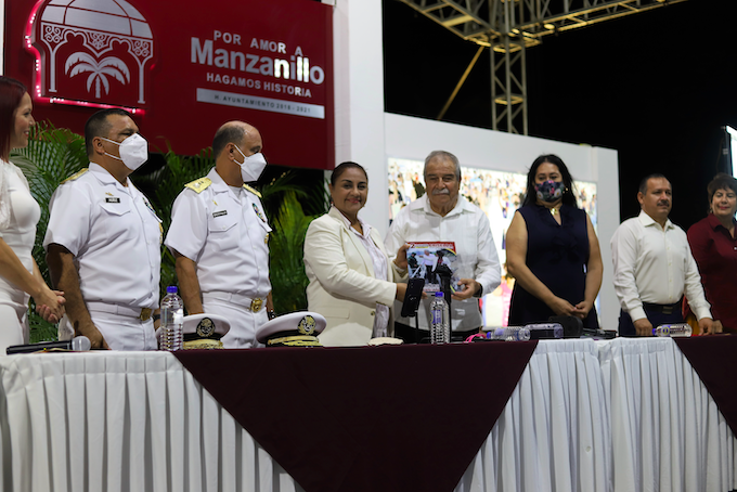 Acompañada por la diputada Araceli García Muro, representante del poder Legislativo, en representación del Gobierno de la República, el Vicealmirante Benjamín Mar Berman, representante personal del Vicealmirante Juan Espinosa Orozco, Comandante de la Sexta Región Naval, y el Contra Almirante Marco Antonio Muñoz Hernández, representante personal del Almirante Salvador Gómez Rangel, Comandante de la Fuerza Naval del Pacífico; la alcaldesa de Manzanillo entregó su 2° informe destacando a los manzanillenses: “No les hemos traicionado y nunca traicionaremos la confianza depositada en nosotros. Nos guían los más profundos anhelos de justicia y libertad y nuestras bases están cimentadas en los principios más sólidos, y así hemos actuado en cada una de las decisiones y políticas de gobierno que hemos implementado, en dos años de gobierno, como”: