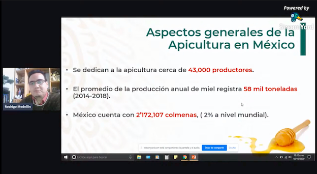 Rodrigo Medellín impartió la videoconferencia “Situación actual de la producción de miel en México” a estudiantes y docentes de la Facultad de Ciencias Químicas de la Universidad de Colima, como parte de la XXXVII Semana del Químico. El experto, quien también ha dado clases en la UNAM, es subdirector de área en la Coordinación General de Ganadería de la Secretaría de Agricultura y Desarrollo Rural.