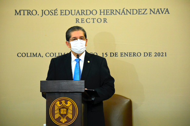 Colima, México, Comunicado (17/01/2021).- Con un resumen de los logros alcanzados durante los ocho años al frente de la Universidad de Colima, este viernes el rector José Eduardo Hernández Nava rindió su cuarto informe de labores del segundo período, en sesión solemne realizada ante el pleno del Consejo Universitario, máximo órgano de gobierno de la institución, en el que destacó como estrategia principal a la educación con responsabilidad social para fortalecer, dijo, “una institución viva, activa, abierta, interconectada y con los valores de unidad, libertad y respeto”.
